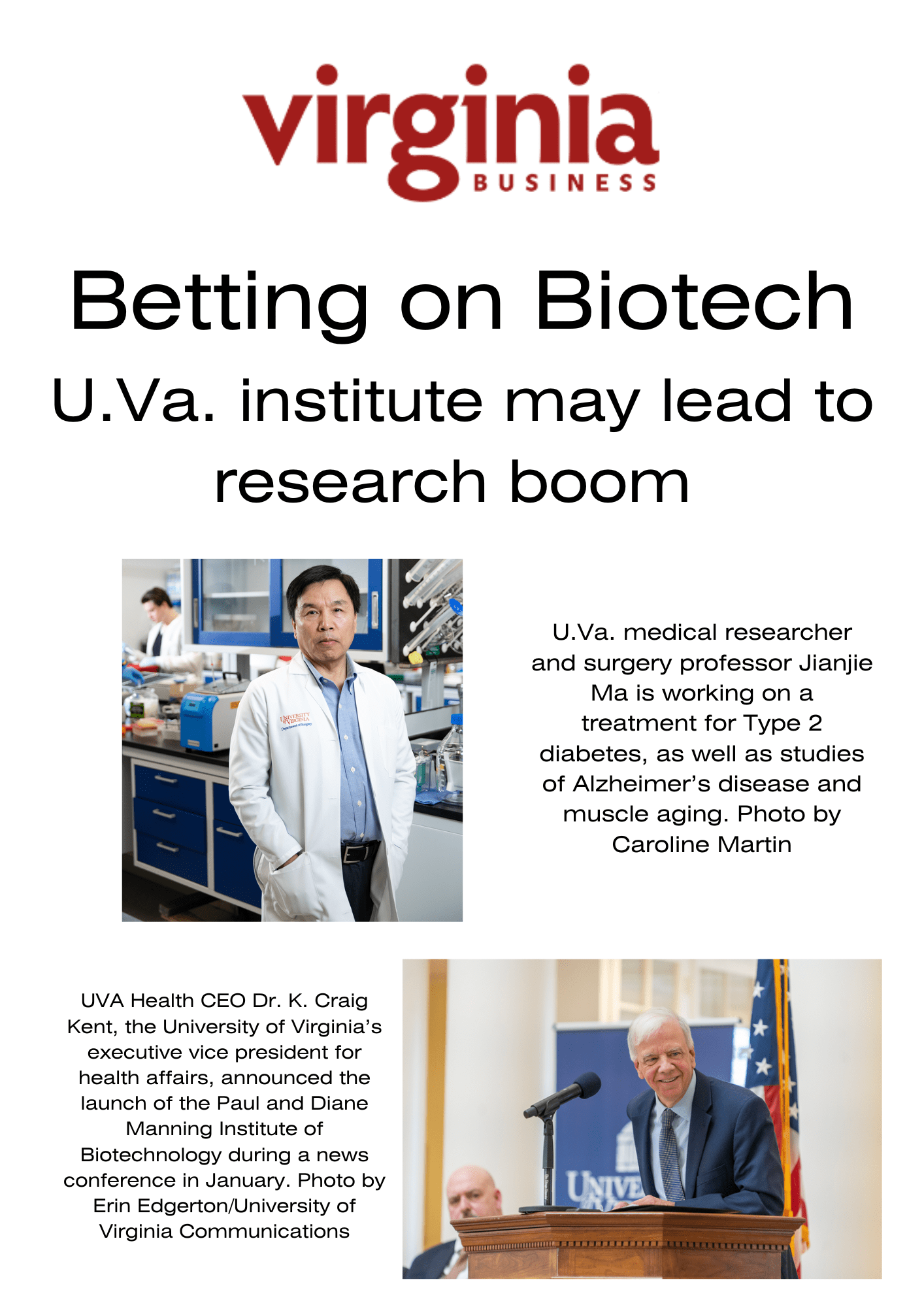 DetailsBetting on biotech U.Va. institute may lead to research boom PUBLISHED APRIL 27, 2023BY CRAIG BELCHER UVA Health CEO Dr. K. Craig Kent, the University of Virginia’s executive vice president for health affairs, announced the launch of the Paul and Diane Manning Institute of Biotechnology during a news conference in January. Photo by Erin Edgerton/University of Virginia…